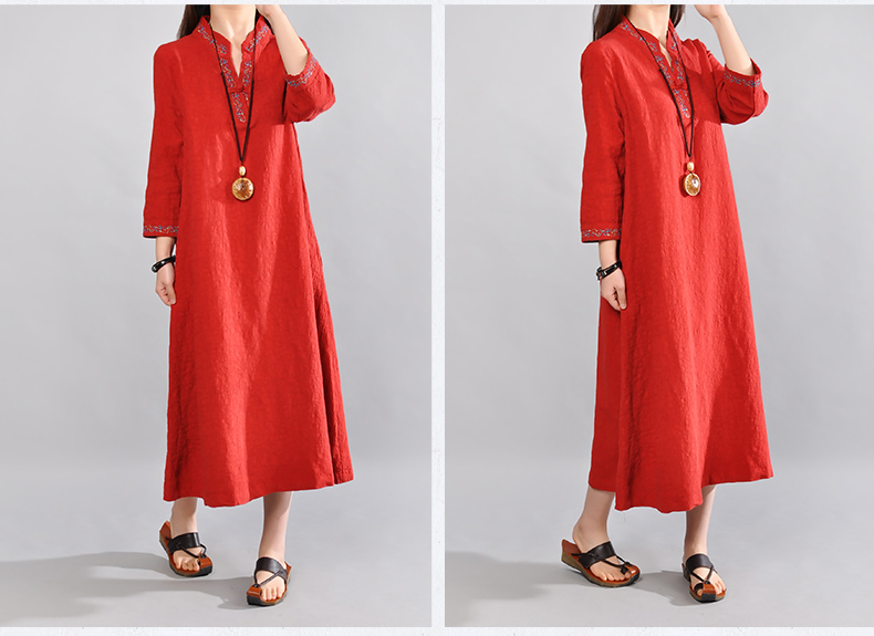 2025 Spring and Autumn new V-neck disc buckle linen embroidery robe cotton dress